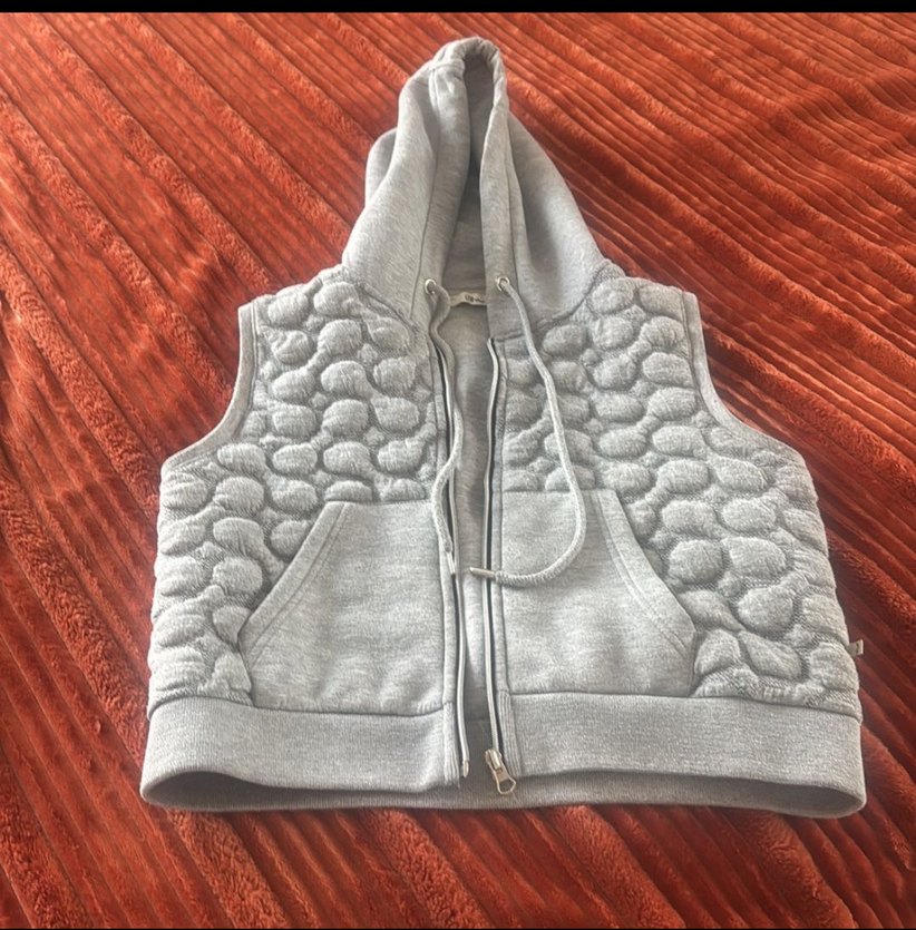 Gri, kapüşonlu ve fermuarlı, kısa kesim çocuk yelek. Dokulu ön yüzeyiyle rahat ve şık bir sokak stili ürünü.