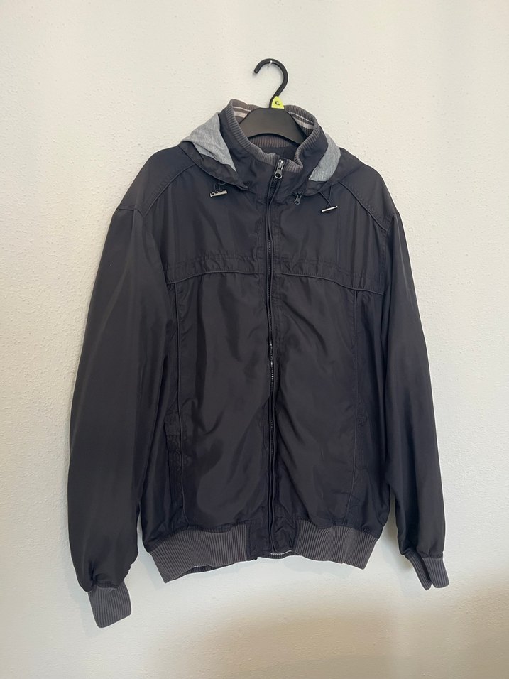 Gri sentetik kumaştan, kapüşonlu ve fermuarlı erkek ceket. Uzun kollu, bol kesim ve midi boyda, dış mekan için uygun.