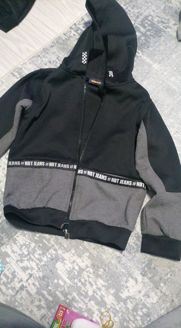Gri ve siyah renklerde, kapüşonlu ve fermuarlı erkek çocuk ceketi. Rahat kesimi ve yumuşak, sıcak kumaşı ile sokak tarzı için uygundur.