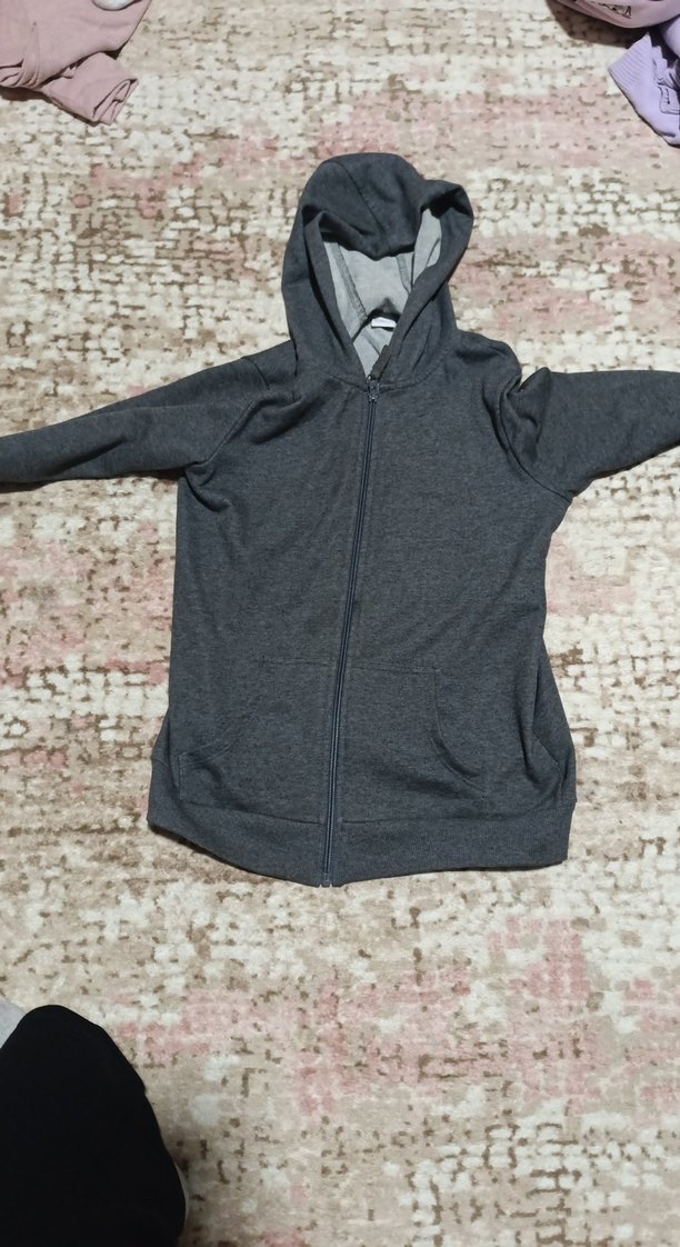 Gri renkte, kapüşonlu ve fermuarlı erkek çocuk sweatshirtü. Yumuşak ve sıcak kumaştan, uzun kollu ve desensiz, rahat sokak stili için uygun.