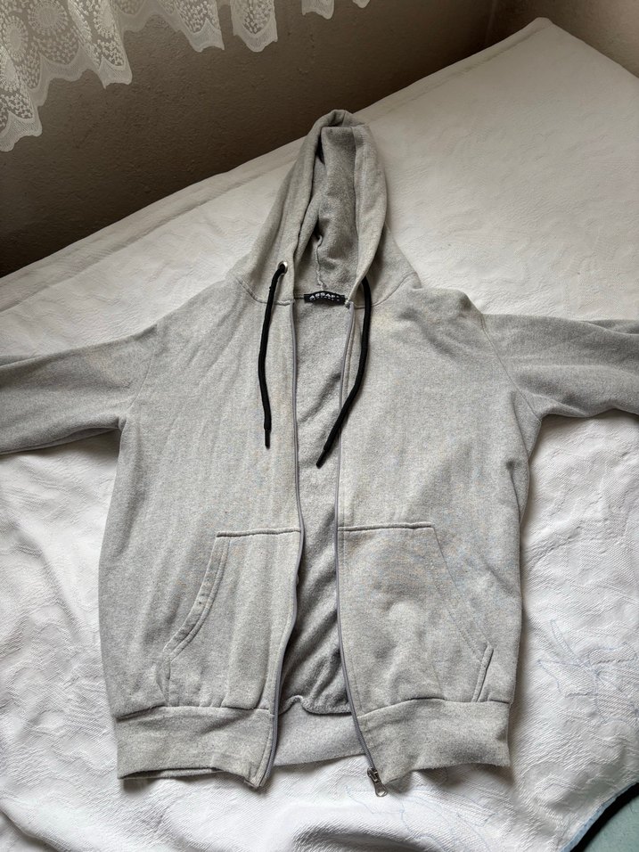 Gri renkte, fermuarlı, kapüşonlu ve uzun kollu erkek sweatshirt. Rahat kesimi ve yumuşak keten kumaşıyla günlük kullanıma uygundur.