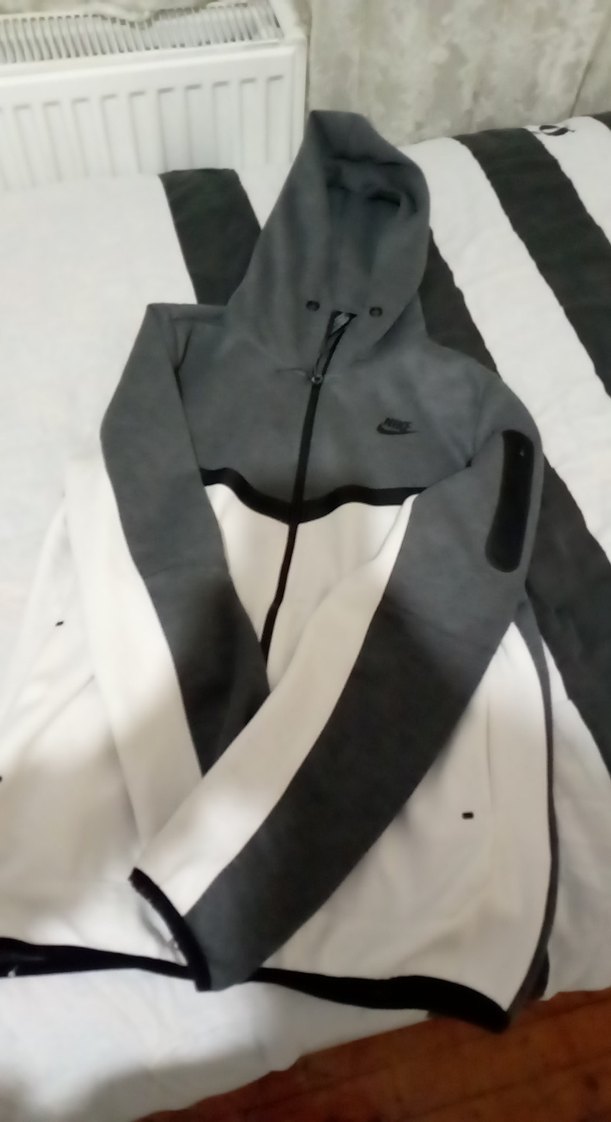 Fermuarlı ve kapüşonlu, gri ve beyaz renkte, uzun kollu ve normal boyda, günlük kullanıma uygun erkek sweatshirt.
