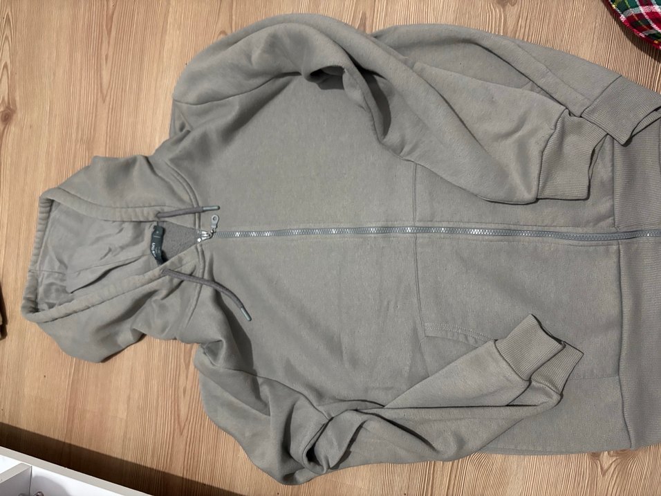 Gri renkte, kapüşonlu ve fermuarlı erkek sweatshirtü. Uzun kollu, rahat kesim ve yumuşak keten kumaştan yapılmıştır.