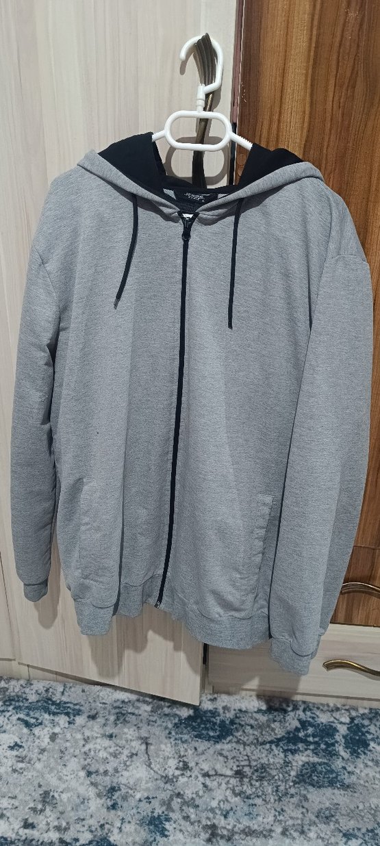 Gri kapüşonlu, fermuarlı, uzun kollu ve bol kesim Hırka. Yumuşak ve sıcak kumaştan üretilmiştir, günlük rahat tarz için uygundur.