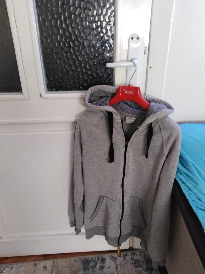 Gri kapüşonlu sweatshirt, fermuarlı ve uzun kolludur. Rahat kesimi ve yumuşak, sıcak kumaşıyla gündelik kullanıma uygundur.