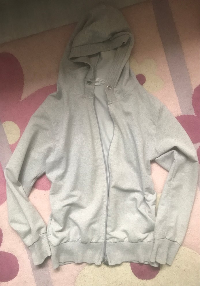 Uzun kollu, kapüşonlu ve fermuarlı gri kadın ceket. Yumuşak ve sıcak kumaştan, dar kesim ve günlük kullanıma uygun sokak tarzı.