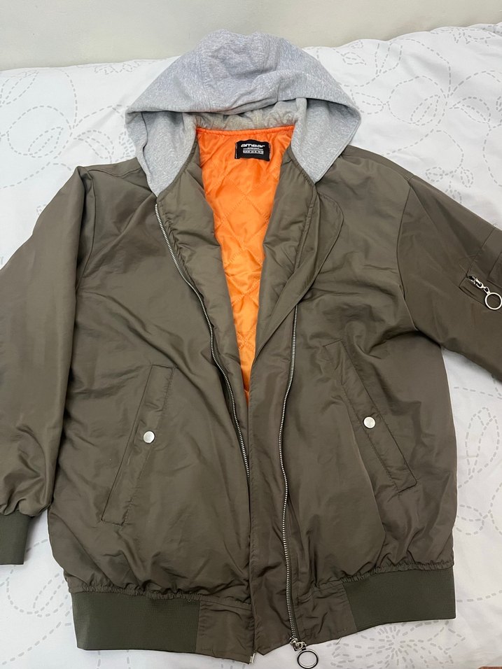Fermuarlı, kesik yaka ve bol kesime sahip kadın ceketi. Uzun kollu, kapüşonlu ve yumuşak kumaşlıdır. Gri renkte, midi boyda, günlük kullanıma uygundur.