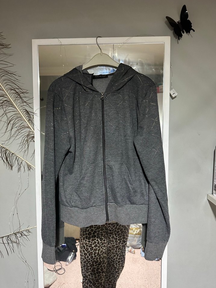 Gri kapüşonlu ve fermuarlı, yumuşak ve sıcak kumaştan yapılmış dar kesim kadın ceket. Uzun kollu ve normal midi boyda, günlük kullanım için uygun.