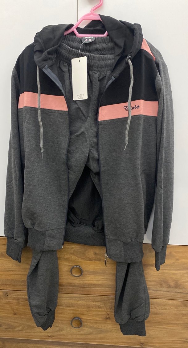 Gri, yumuşak kumaştan fermuarlı ve uzun kollu kadın eşofman takımı. Crew neck yakalı ve pembe şerit detaylı, rahat ve günlük kullanım için uygun. ♀️