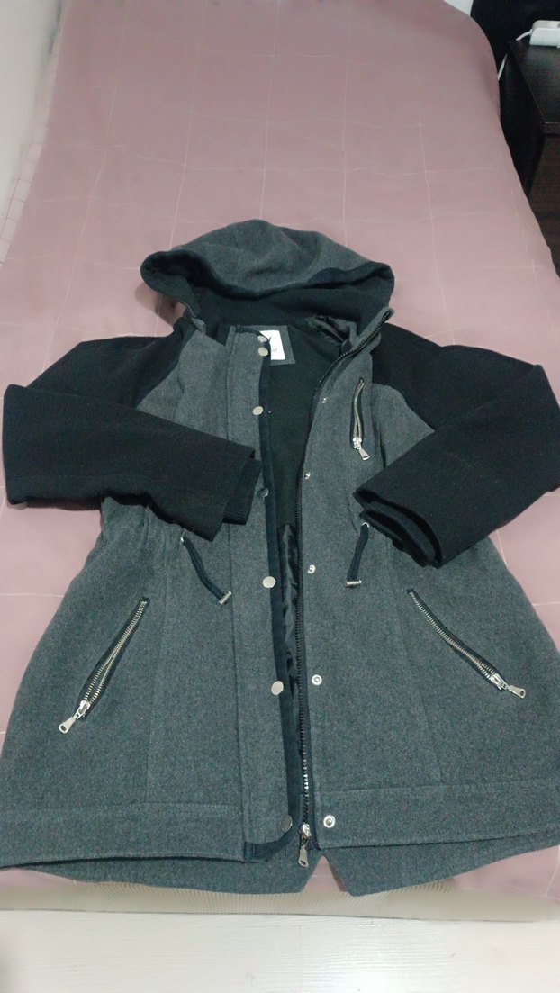 Gri kapüşonlu kadın ceketi, notched lapel ve uzun kollu, yumuşak ve sıcak dokulu kumaştan, fermuarlı cepler ve önde fermuar detaylı, rahat kesimdir.