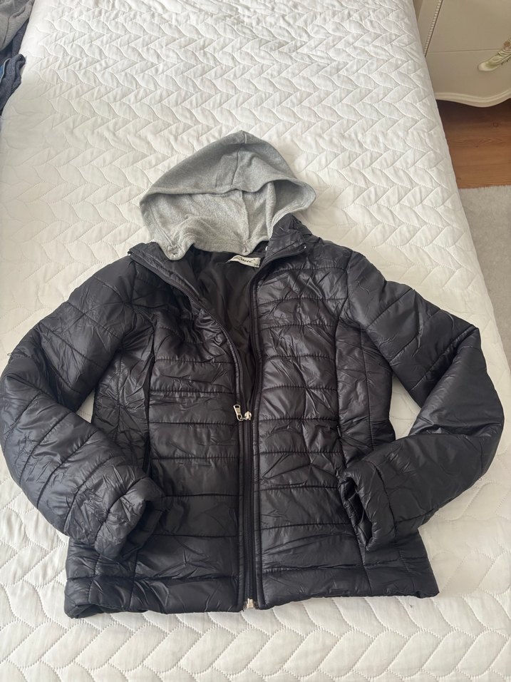 Gri renkte, kapüşonlu ve fermuarlı, uzun kollu, normal midi boyda, rahat kesim kadın ceketi rengi tam siyahtır ışıktan dolayı açık renk gibi görünüyor sadece