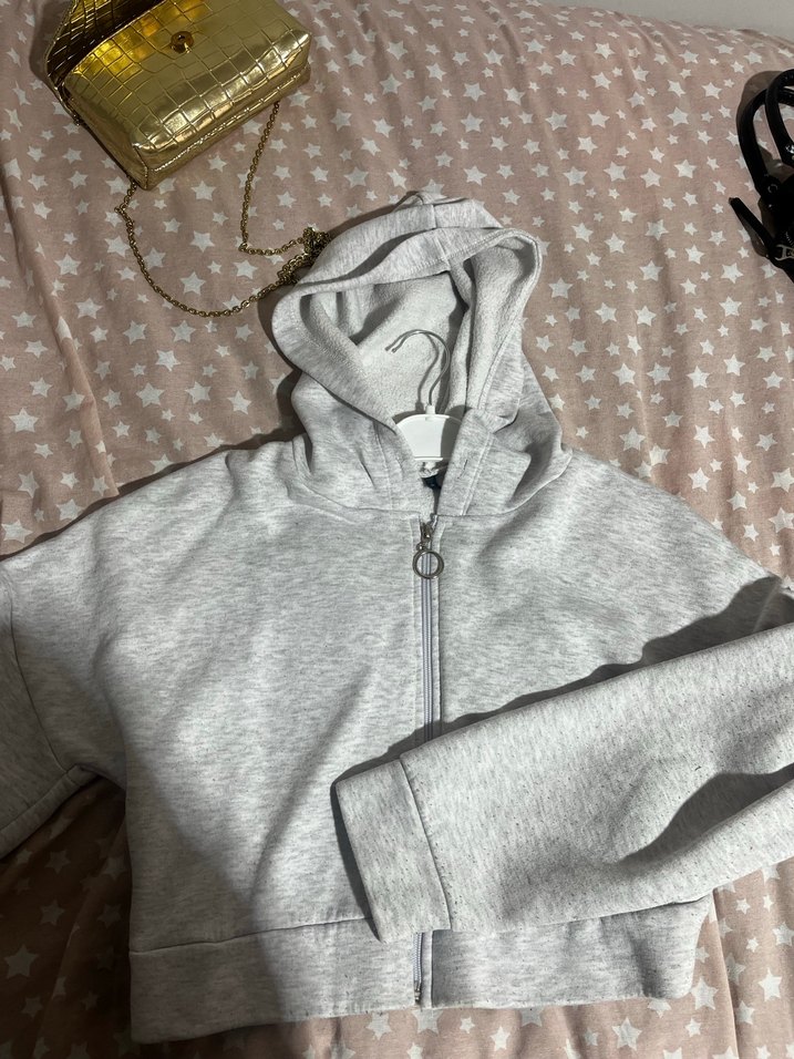 Kapüşonlu, fermuarlı ve uzun kollu, yumuşak ve sıcak kumaştan yapılmış, günlük sokak stili için uygun, gri renkli, orta uzunlukta dar kesim sweatshirt.