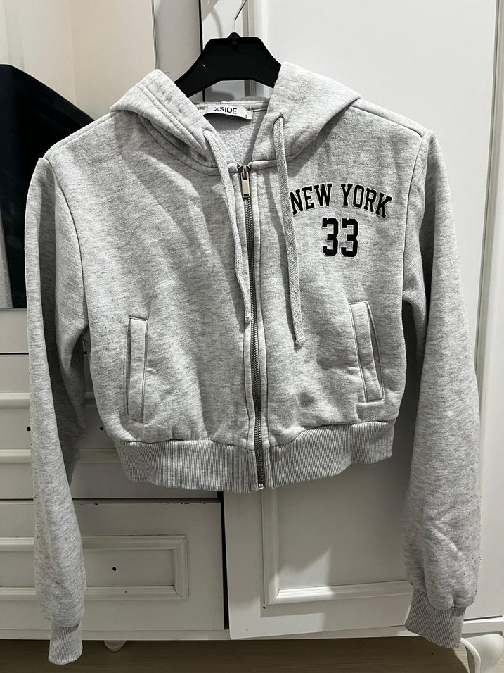 Bu gri kapüşonlu sweatshirt, fermuarlı ve baskılı 'New York 33' yazılıdır. Uzun kollu, orta boy ve yumuşak, sıcak kumaştan yapılmıştır.