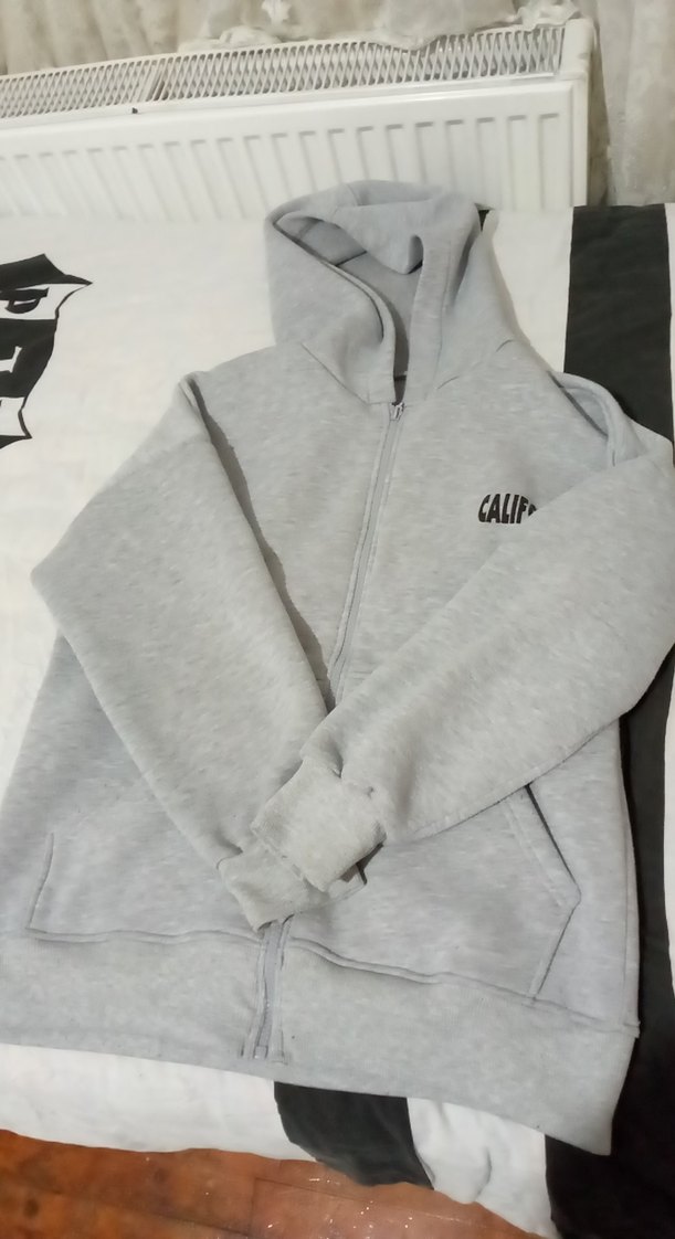 Gri kapüşonlu sweatshirt, fermuarlı ve uzun kollu. Yumuşak ve sıcak kumaştan, bol kesim, sade desensiz, göğsünde 'CALIF' yazısı bulunur.