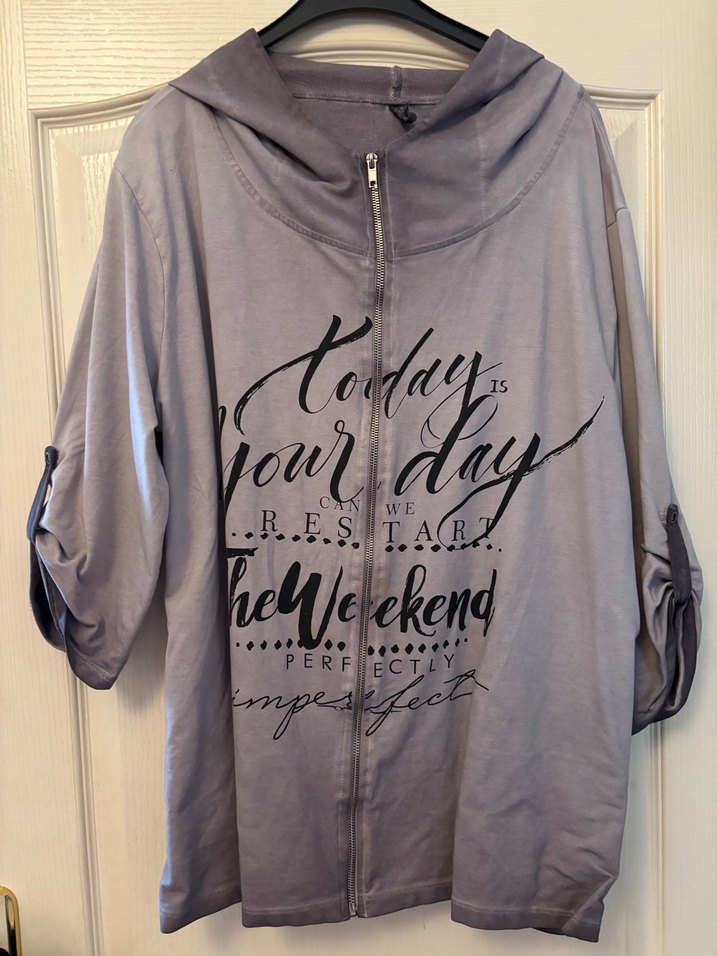 Gri renkli, keten kumaştan, kapüşonlu ve fermuarlı kadın sweatshirt. Bol kesim ve uzun kollu, baskılı tasarıma sahip, günlük rahat stil için uygun.