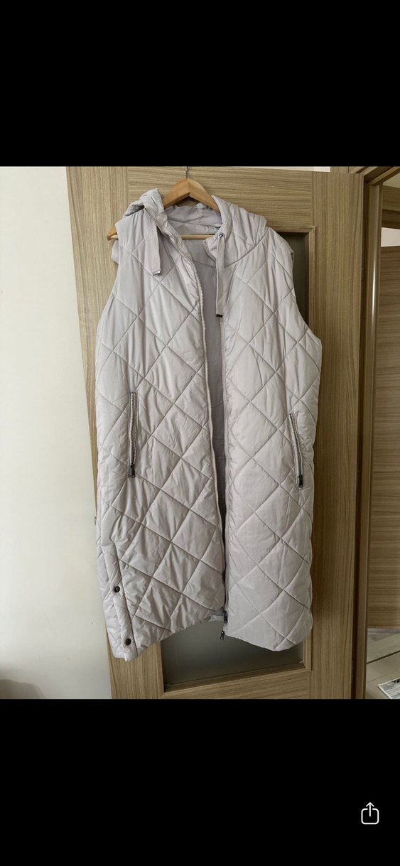 Yumuşak paraşüt kumaştan yapılmış, fermuarlı ve kapüşonlu gri, kolsuz kadın yeleği. Oversize kesim ve uzun boyda, günlük rahat sokak stiline uygun.
