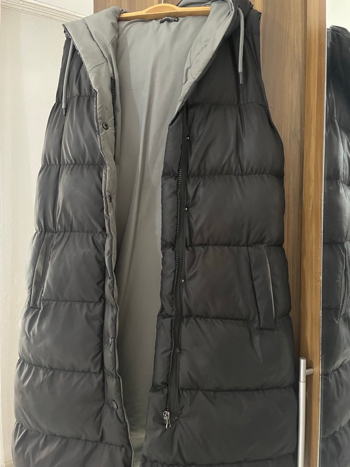 Gri renkli, kapüşonlu ve fermuarlı bu kadın yeleği, yüksek yakalı ve kolsuzdur. Sentetik kumaştan üretilmiş, rahat ve şık bir sokak stili sunar.