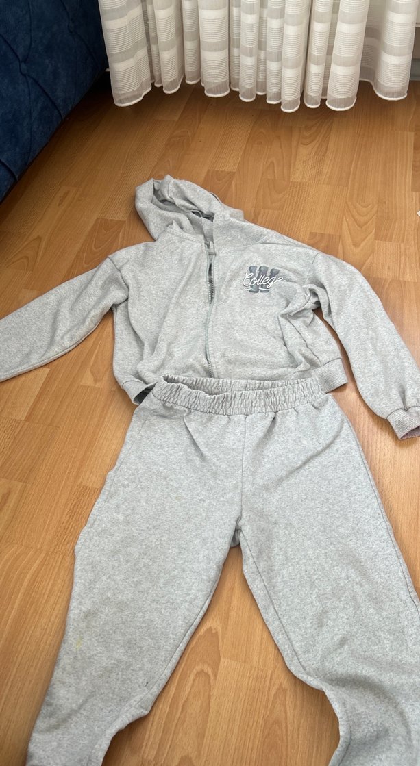 Yumuşak kumaştan, fermuarlı ve kapüşonlu, bol kesim gri kız eşofman takımı. Uzun kollu ve bisiklet yaka, rahat sokak stili için uygundur.
