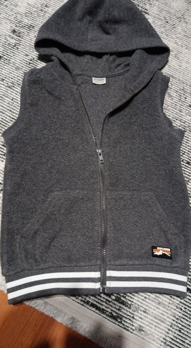 Polar yumuşak ve sıcak kumaştan, fermuarlı, kapüşonlu, yüksek yakalı gri erkek çocuk yeleği. Dar kesim ve çizgili etek ucu ile sokak tarzı.