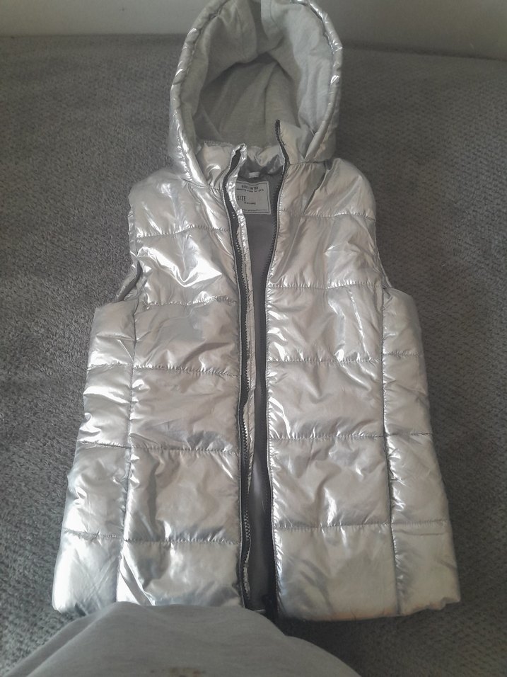 Gri, kapüşonlu ve fermuarlı, parlak görünümlü kadın yelek. Kolsuz ve vücuda oturan kesimiyle rahat sokak stiline uygundur.