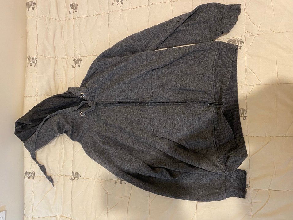 Kadin için gri kapüşonlu sweatshirt, tam ön fermuar ve uzun kollu. Yumuşak, sıcak kumaştan, rahat ve bol kesim. Düz tasarım, günlük kullanıma uygun.