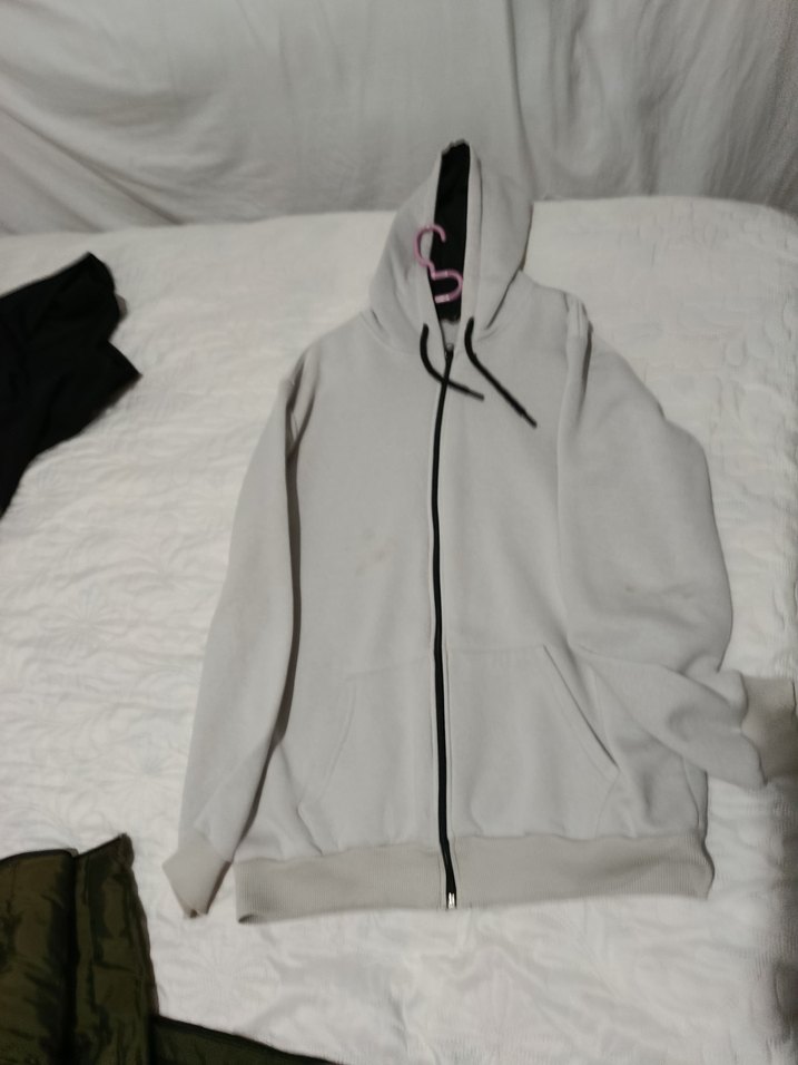 Gri kapüşonlu sweatshirt, fermuarlı ve uzun kolludur. Yumuşak ve sıcak kumaştan, bol kesim ve normal boyda olup günlük rahat kullanım için uygundur. Lbeden ön tarafında ufak leke var onun dışında bi kusuru yok