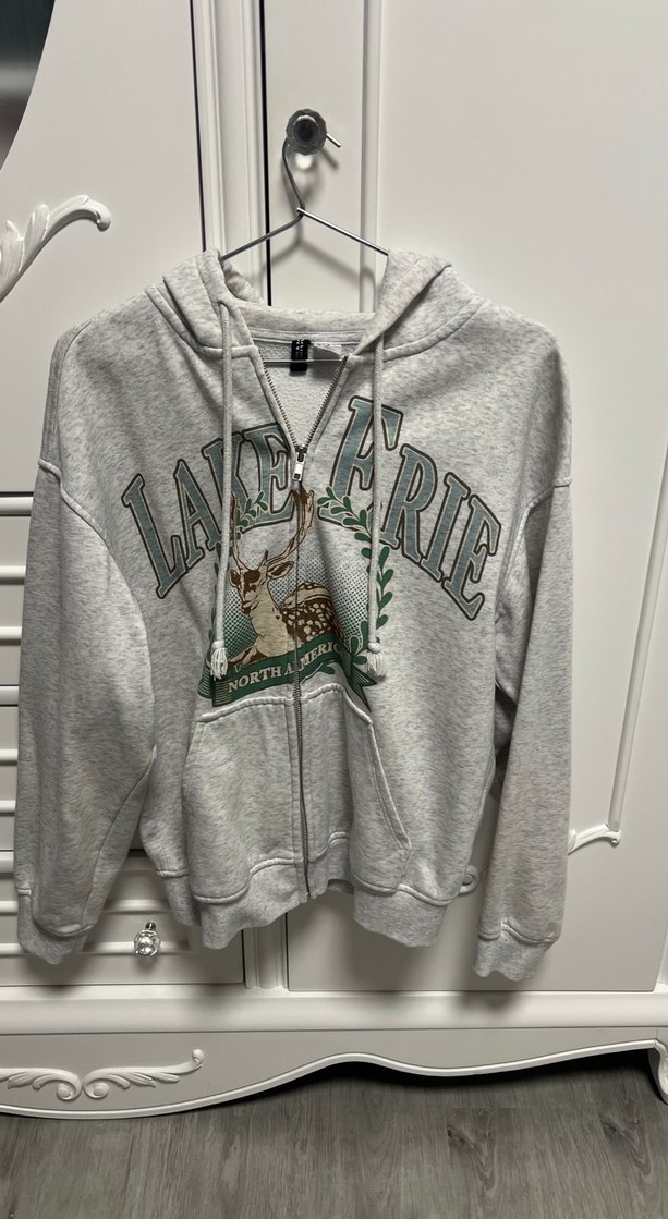 Gri renkli, fermuarlı, uzun kollu ve bol kesim sweatshirt. Üzerinde Kuzey Amerika ve geyik baskısı bulunur. Rahat ve sıcak kumaştan yapılmıştır. Beden XXS