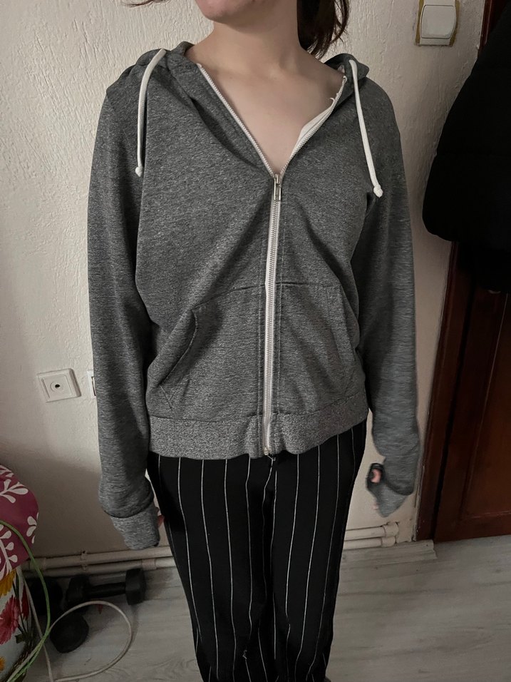 Gri, bol kesim, fermuarlı, yumuşak ve sıcak kumaştan yapılmış, yüksek yakalı ve uzun kollu günlük sokak stili sweatshirt. L diyor fakat M uyumludur