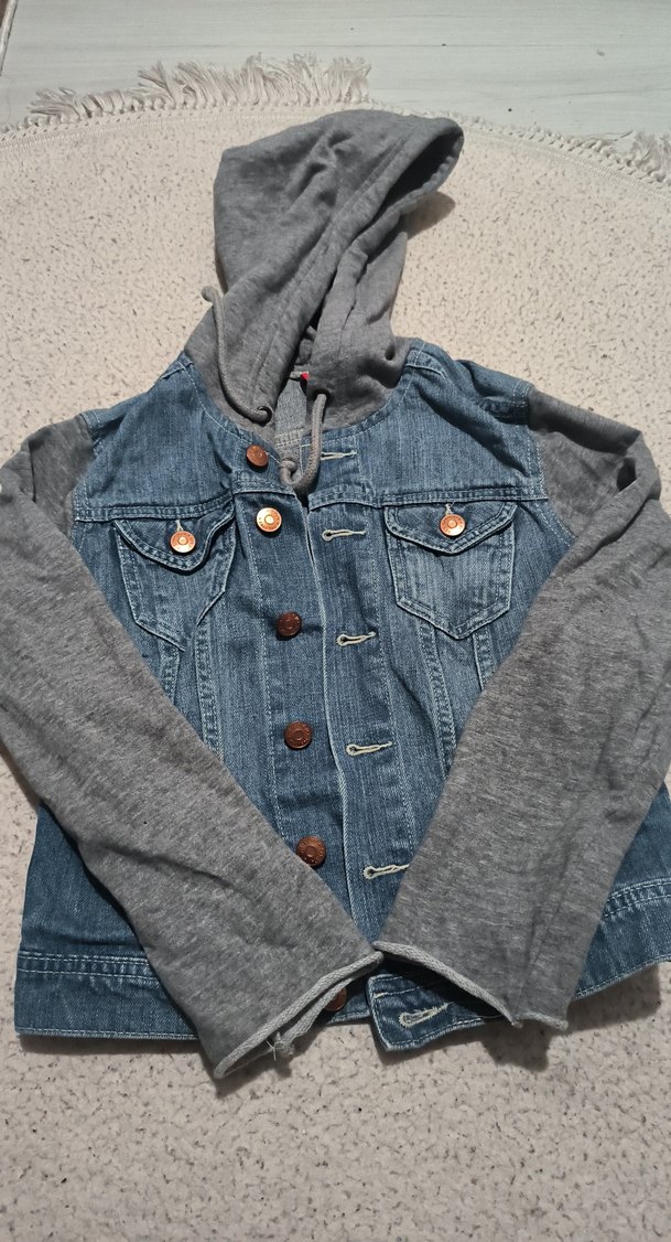 Düğmeli önü, uzun gri kolları ve gri kapüşonlu kadın denim cekettir. Günlük kullanıma uygun, normal boy ve dar kesimdir.