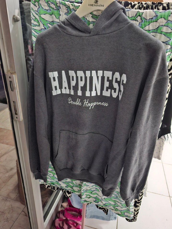 Gri pamuklu kapüşonlu sweatshirt, uzun kollu ve bol kesim. "HAPPINESS" baskılı, rahat sokak stili için uygun. M beden