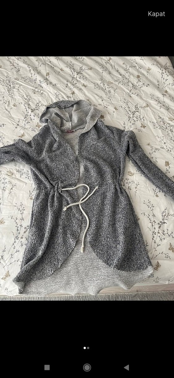 Gri renkte, kapşonlu L beden yazıyor ama S-M-L tüm bedenlere olur.Rahat spor ve kullanışlı bir parça birkaç defa giydim tertemiz.