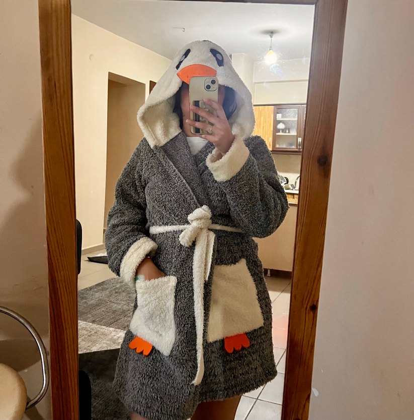 Gri, kapüşonlu ve uzun kollu kadın bornoz, yumuşak ve sıcak kumaştan. Önden bağlamalı, ceplerde turuncu detaylar ve ördek desenli kapüşon bulunur. S M bedendir .
