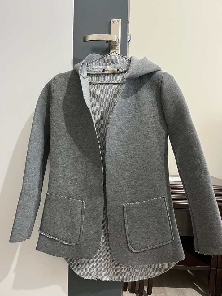 Gri renkte, kapüşonlu ve uzun kollu kadın ceket, yumuşak örme kumaştan üretilmiş. Normal kesim ve midi boyda, rahat ve gündelik tarz için uygundur. L bedendir ancak S beden ile uyumludur ölçüsü.