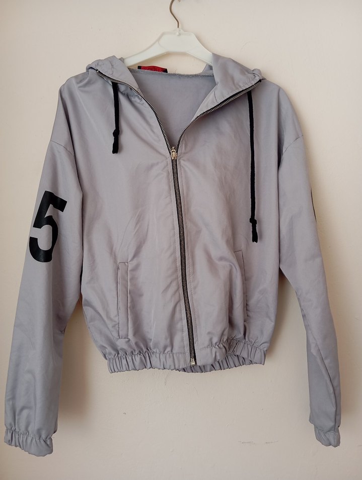 Kısa boylu, kapüşonlu, uzun kollu kadın ceket. Fermuarlı, bol kesim, kolunda baskılı numara detayı vardır. Sentetik kumaştan üretilmiştir. M bedene uygundur.