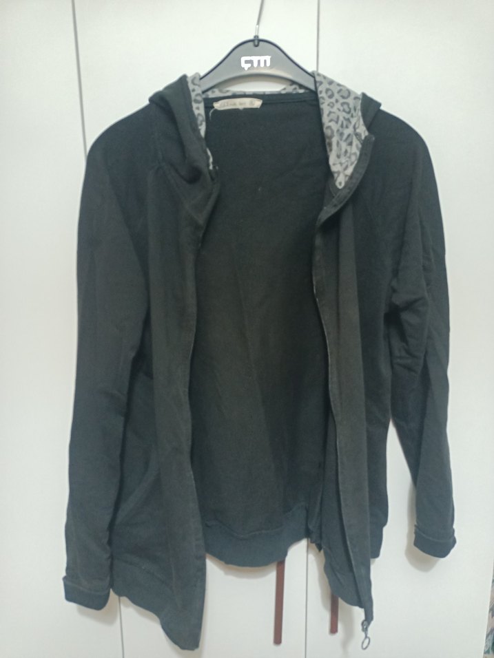 Gri keten kumaştan, kapüşonlu ve fermuarlı, bol kesim uzun kollu kadın ceketi. İç kısmında leopar desenli astar bulunur. Günlük kullanım için uygundur.