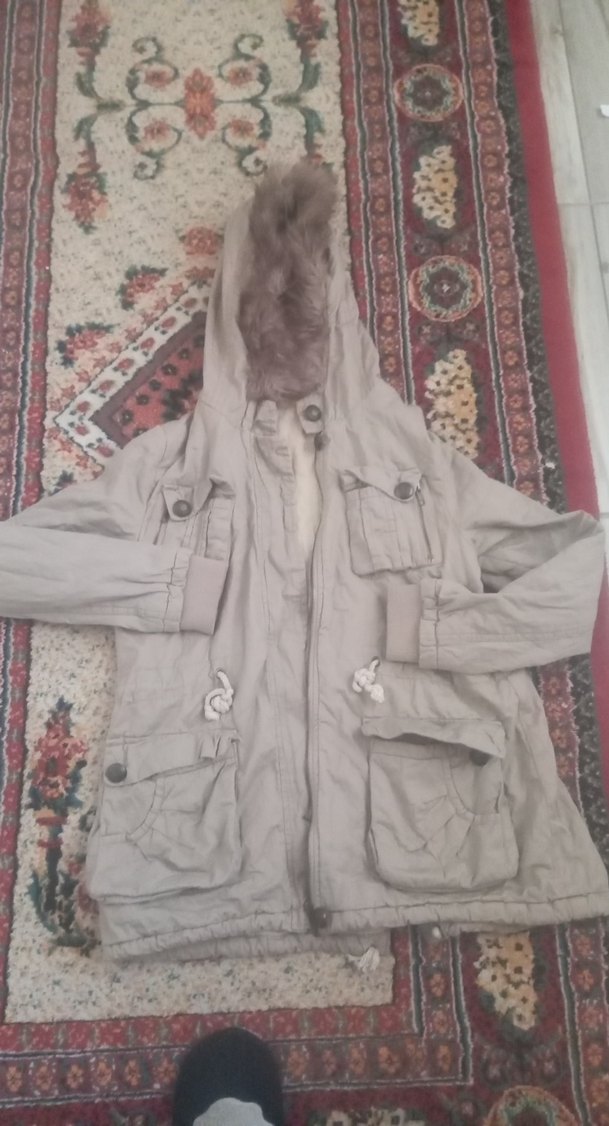 Gri kadın ceketi, kapüşonunda kürk detayı ve rahat kesime sahiptir. Uzun kollu, çok cepli ve midi boydadır, günlük kullanım için uygundur.