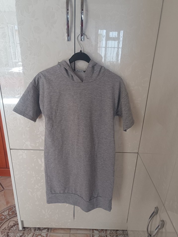 Gri renkli kapüşonlu kadın yazlık kısa elbise