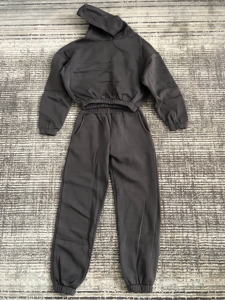 Şardonlu.için gri, kapüşonlu ve uzun kollu, rahat kesim eşofman takımı. Elastik bel ve paça detaylarıyla konforlu ve şık bir görünüm sunar. ♀️