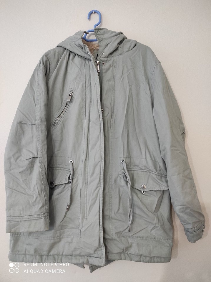 Gri keten kumaştan, kapüşonlu ve fermuarlı uzun kollu bol kesim kadın ceket. cepli ve rahat bir tasarım. içi kürklü çok giyilmedi.