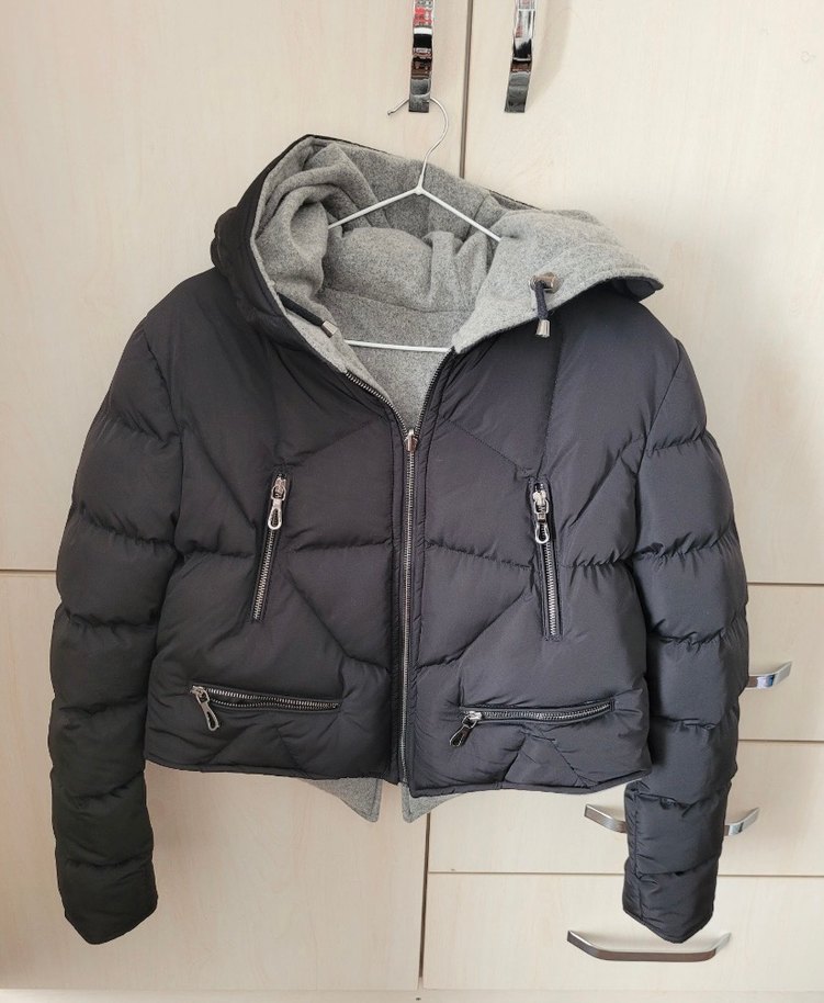 Bu kadın kısa mont, yüksek yakalı ve fermuarlı ceplere sahip, içi gri yumuşak kumaş kapüşonlu, dışı siyah dolgulu rahat ve şık bir sokak stili ürünü. Çok sıcak tutuyor ve hiç kullanılmadı sorunsuz üründür çift taraflı giyilmektedir tek üretim üründür devamı yoktur
