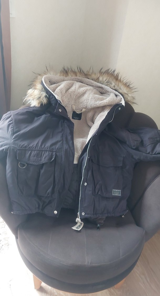 Gri renkli, kapüşonlu ve kürk detaylı kadın kışlık mont. Yumuşak ve sıcak kumaştan, uzun kollu ve midi boyda, sokak stiline uygun bir model. ❄️
