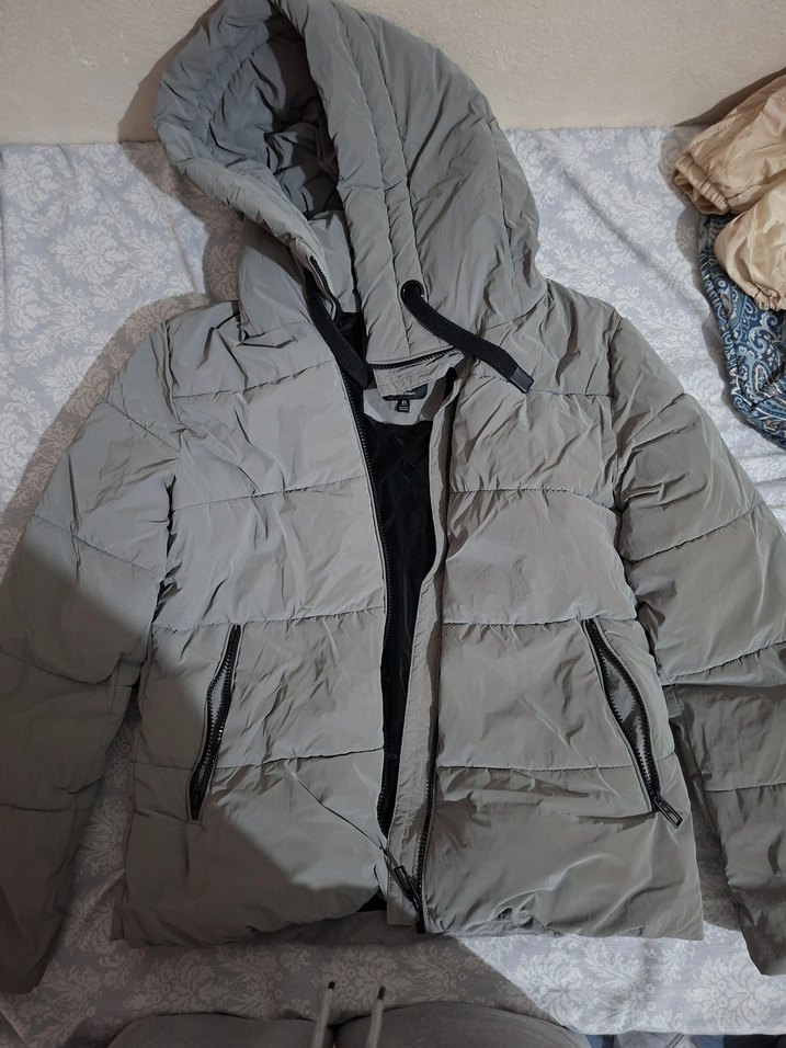 Gri renkli, kapüşonlu ve fermuarlı ceplere sahip kadın kışlık mont. Yumuşak sentetik kumaştan, uzun kollu ve midi boyda, dış mekan kullanımı için uygun.
