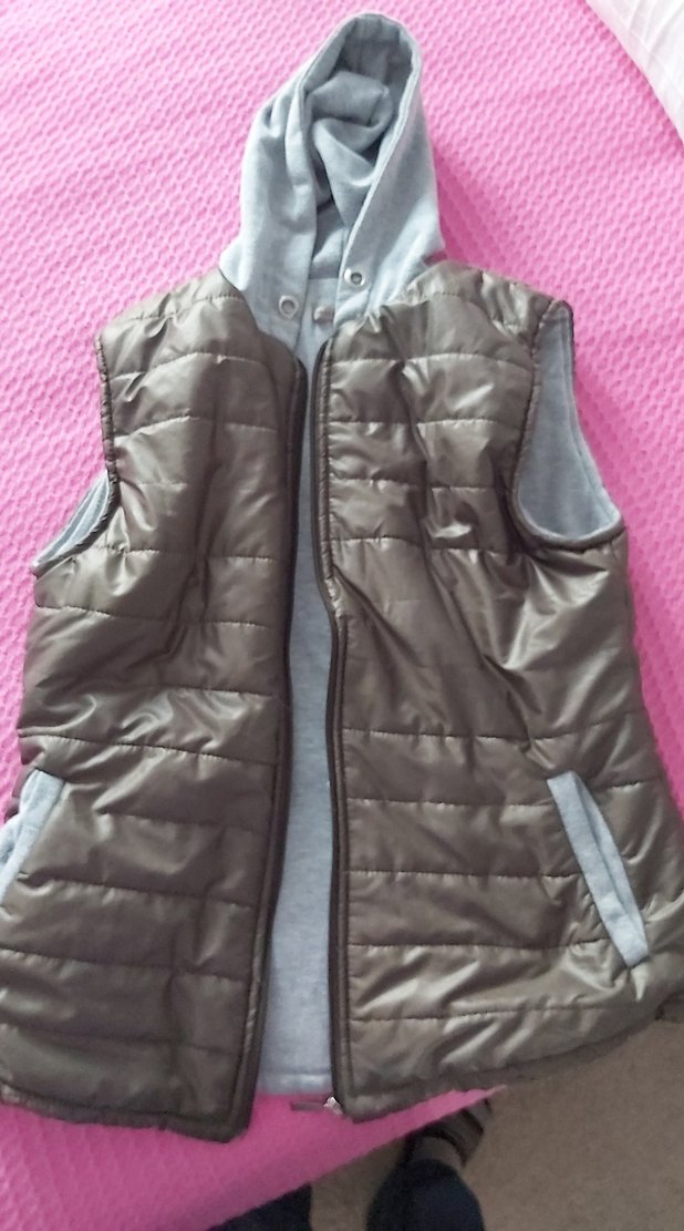 Gri, kapüşonlu, fermuarlı, kolsuz şişme yelek. Sentetik kumaştan, dar kesim ve normal midi boyda, günlük rahat sokak stili için uygundur.