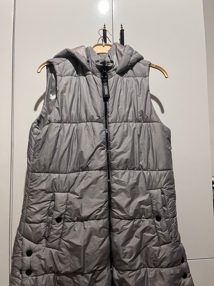 Gri renkte, düğmeli, kapüşonlu ve kolsuz kadın yeleği. Yüksek yakalı, midi boyda ve sokak stili için uygun şişme model.