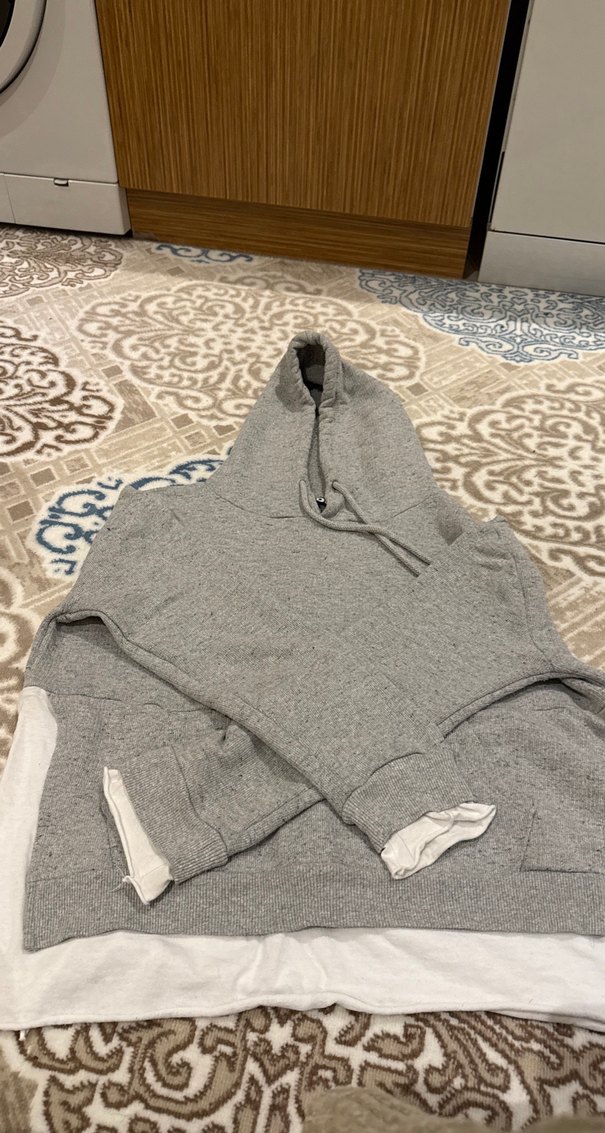 Gri kapüşonlu sweatshirt, bol kesim ve uzun kollu. Keten kumaştan, fermuarlı detaylı, günlük kullanım için rahat ve şık bir tercih.
