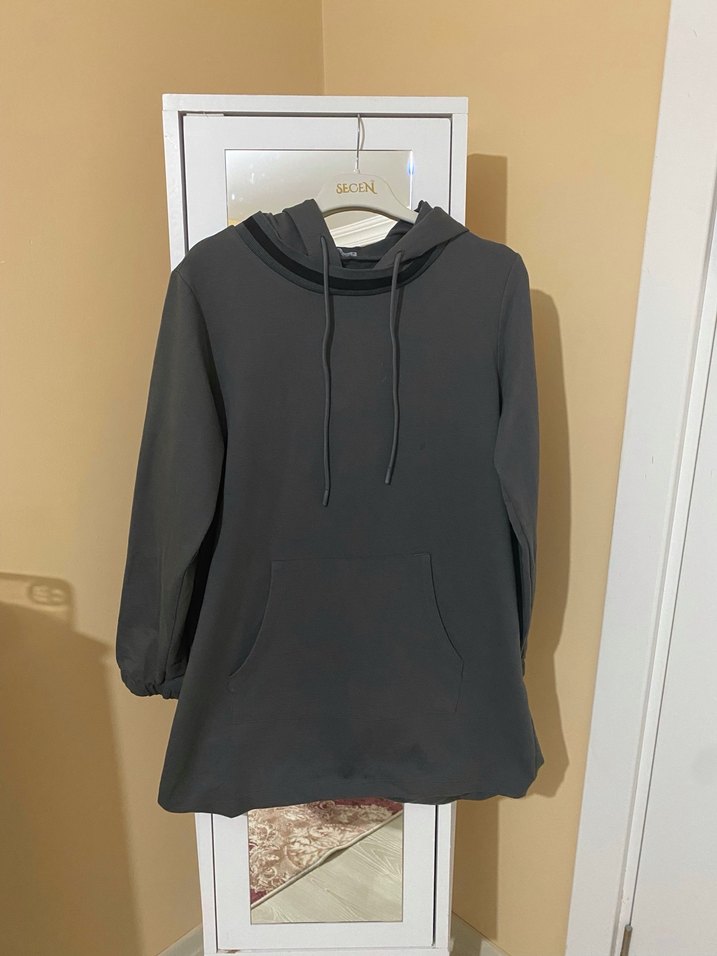 Gri renkte, kapüşonlu ve kanguru cepli, uzun kollu, bol kesim kadın sweatshirtü.