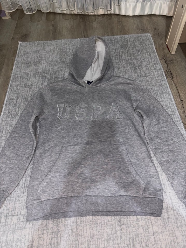 Gri kapüşonlu, uzun kollu ve ön cepli sweatshirt. Rahat kesimi ve yumuşak kumaşıyla günlük kullanıma uygun. Üzerinde USPA logosu bulunur.