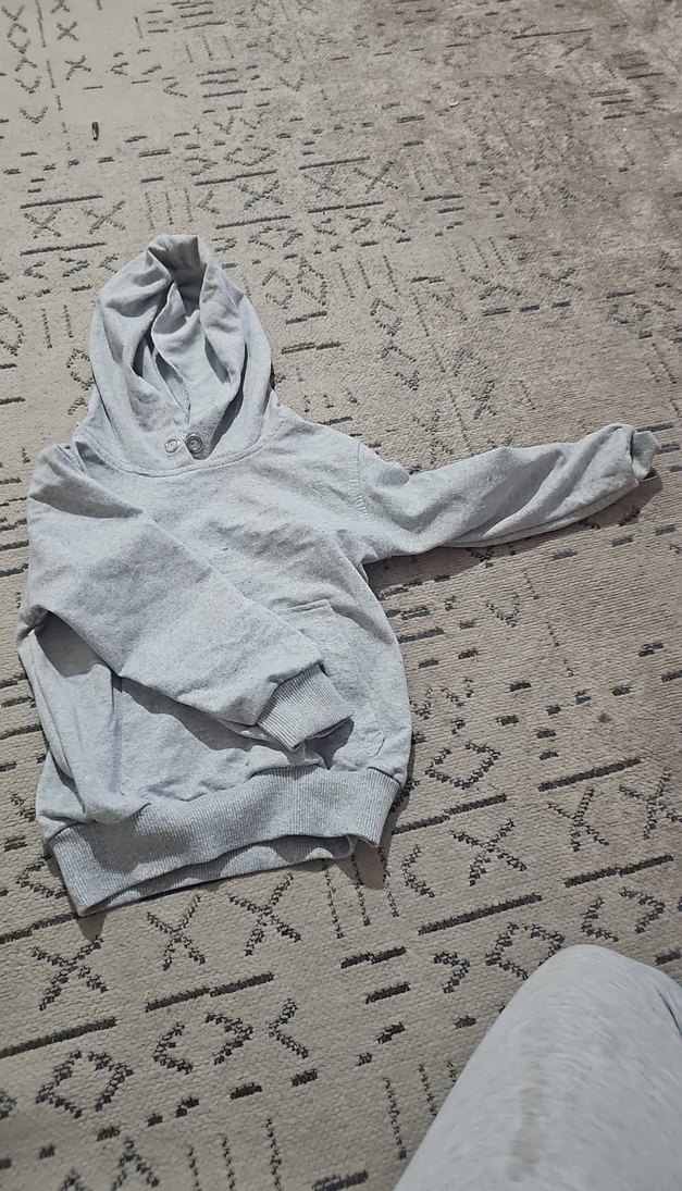 Gri renkli, kapüşonlu, uzun kollu çocuk sweatshirtü.günlük kullanıma uygun sade tasarım.