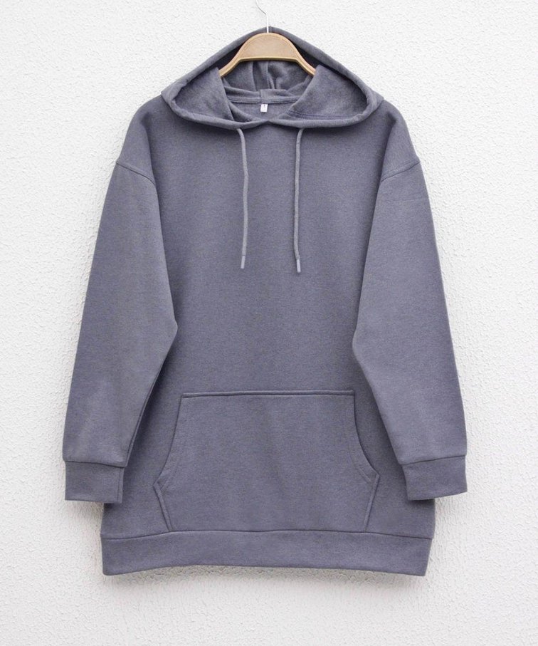 Gri kapüşonlu kadın sweatshirt, yumuşak ve sıcak kumaştan üretilmiş. Bol kesim ve kanguru cepli, rahat ve günlük sokak stili için uygun.