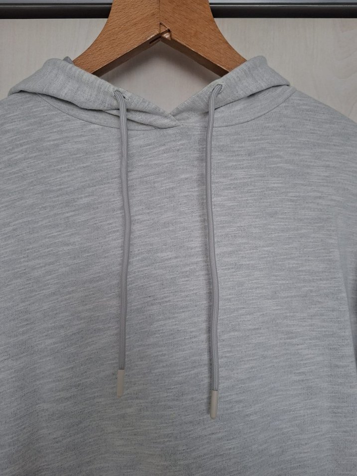 Yumuşak keten kumaştan yapılmış, kapüşonlu ve uzun kollu bol kesim gri sweatshirt. Günlük kullanım için rahat ve sokak stili sunar.